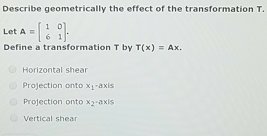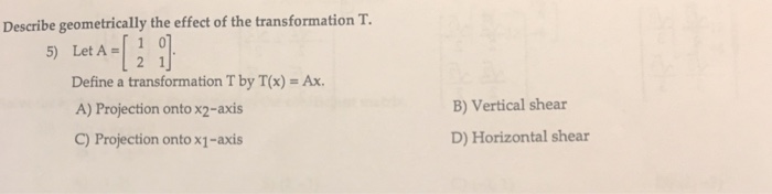 Solved Describe Geometrically The Effect Of The Transformation T 11 Let A Define A Transformation Tby T X Ax Gprojection Onto The Yz Plane C Projection Onto They Axis B Horizontal Shear D Vertical